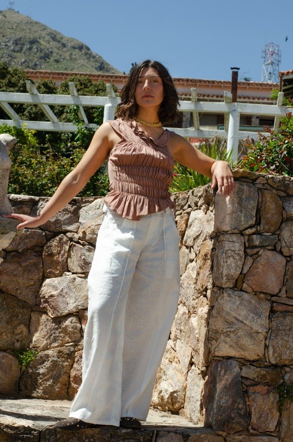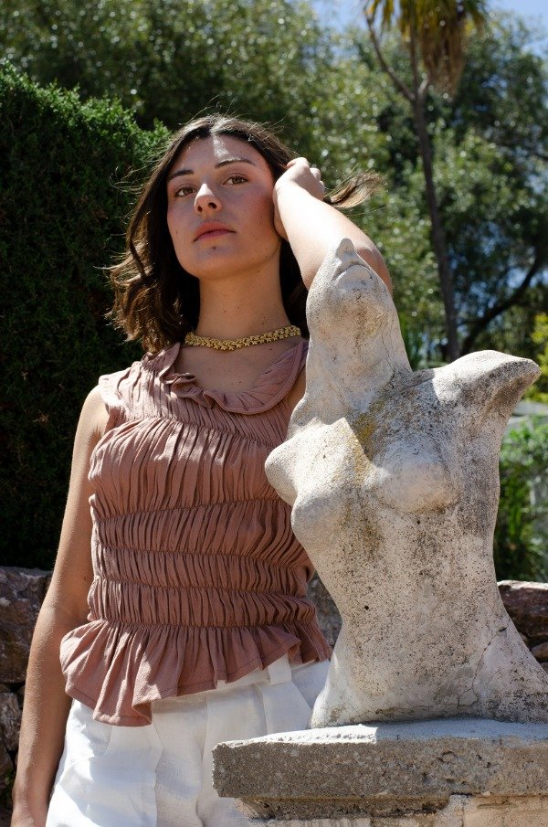 Blusa drapeada con elástico interno, solo en delantero, en formas diagonales que generan una sutileza en su volumen final. La espalda es lisa. Asimétrica, un hombro es mas ancho que el otro y tiene un lado diagonal. Se adapta hasta tres talles más ya que su delantero es el doble de tela de ancho. Color : Ladrillo